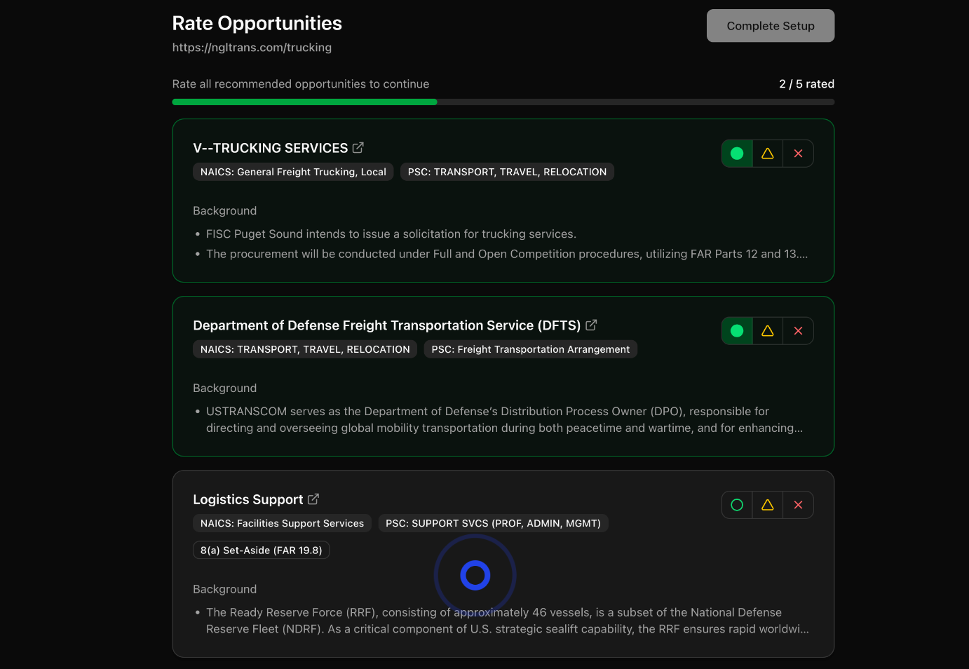 Our AI starts by identifying relevant solicitations that match your business. It analyzes your website, NAICS/PSC codes, and keywords using natural language processing to understand what you actually do.