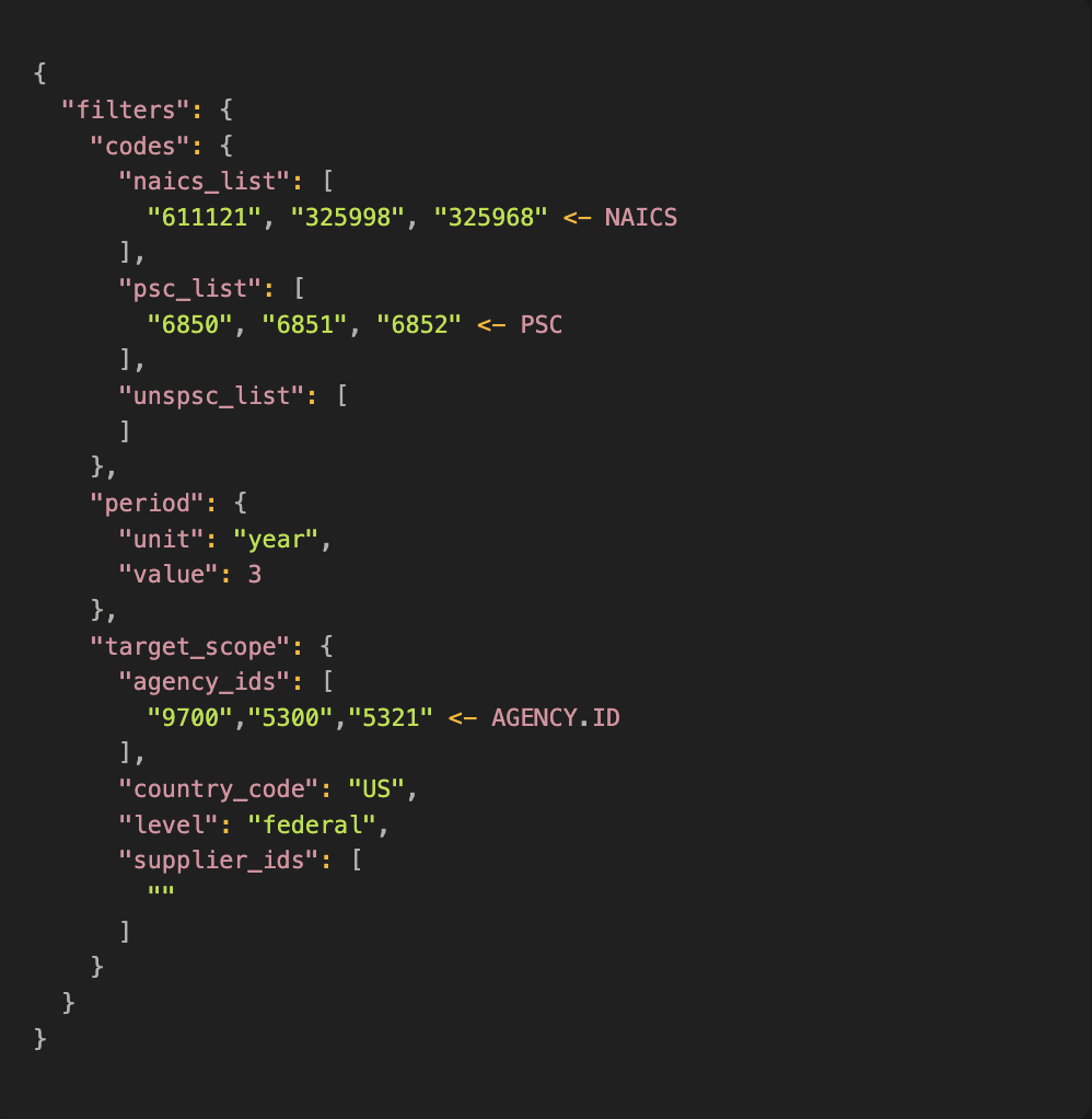 Finally, our Supplier CSV Extraction API calls the backend to generate a list of suppliers that match your filters, including agency ID, NAICS, and PSC combinations.